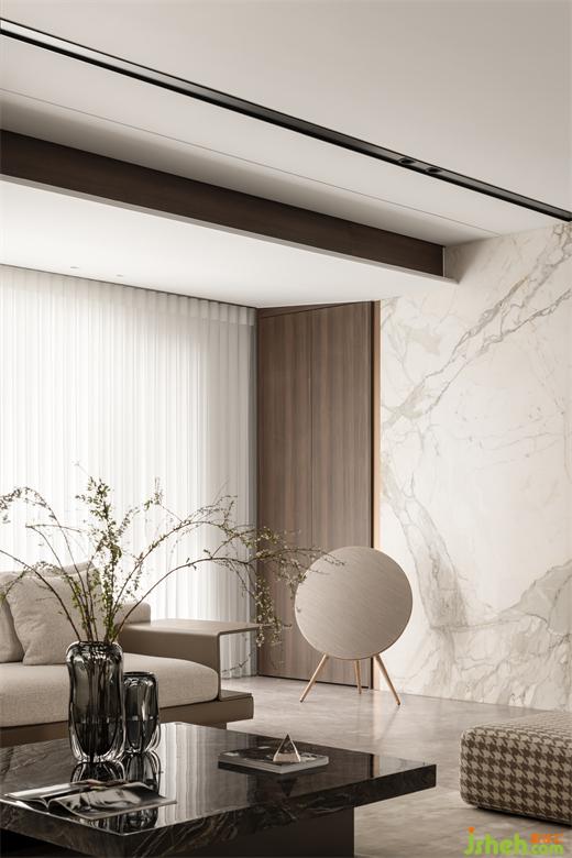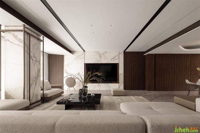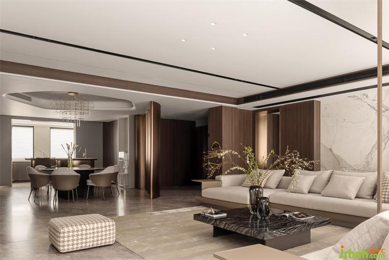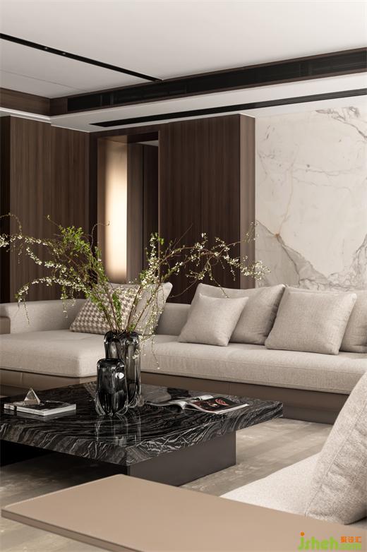 看似干凈統(tǒng)一的客餐廳實(shí)則蘊(yùn)藏深意。外包陽臺后,客廳擁有了令人艷羨的空間尺度。杭州大平層裝修設(shè)計(jì)以木飾面梳理空間秩序,臥室進(jìn)門隱藏在木紋肌理之中。現(xiàn)代意式的質(zhì)感來自金屬、大理石、巖板、木飾面等多重材質(zhì)的和諧運(yùn)用;平層住宅大空間的無主燈設(shè)計(jì)更考驗(yàn)設(shè)計(jì)師對于光線營造的功底: