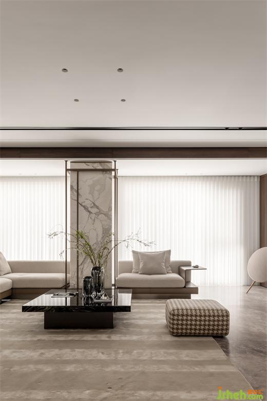 住宅中最大的共享公區(qū),更要兼顧服務(wù)型功能需求與氛圍的營造。杭州大平層裝修設(shè)計(jì)取締傳統(tǒng)的柜體、墻體玄關(guān),而使用金屬材質(zhì)打造一個“絲滑”的隔斷分離入戶門與餐廳,在方正規(guī)整的空間里蔓延出一片動感的“波浪”。每一個進(jìn)入室內(nèi)的訪客都會被這片金屬波浪所吸引,將視線首先投入公區(qū)主要的客廳空間——這是意式風(fēng)格中不尋常的異形結(jié)構(gòu)帶來的點(diǎn)睛之筆。