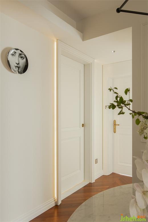 面對小戶型的采光問題,設(shè)計師利用疊加的門套厚度定制出空間的線性光源,在滿足空間照明的基礎(chǔ)上縱向拉伸了層高。