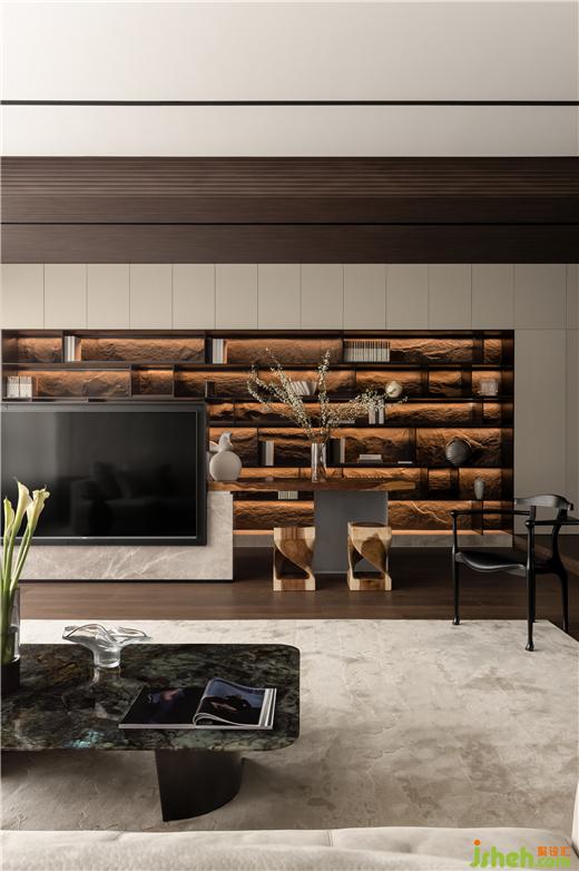 本案的特殊之處在于原始結(jié)構(gòu)中接近四米的層高:中贏星際豪宅設(shè)計(jì)非同一般平層住宅空間優(yōu)越條件,卻少了一些人在實(shí)際生活中的尺度。設(shè)計(jì)師重置了尺度系統(tǒng),將寬裕的高度轉(zhuǎn)化為組合光源的深度;墻面兩側(cè)通高的大理石與柜體均在展示著利落而硬朗的空間氣質(zhì)。
