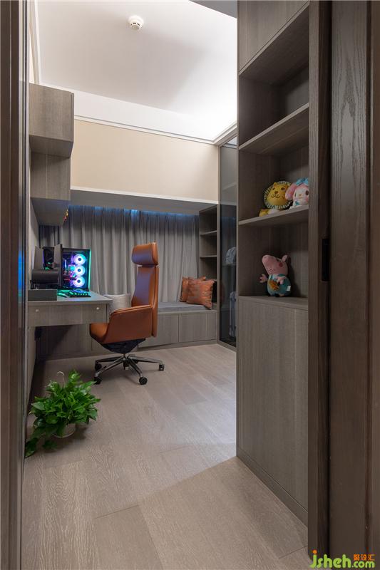次臥床頭絨布硬包背景與柜子相融一體,在一束暗藏暖光映射下,讓整個身心非常放松,
