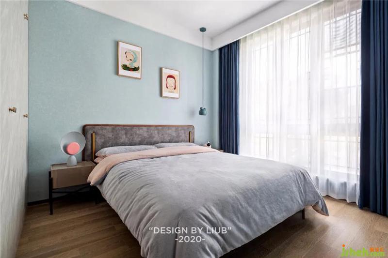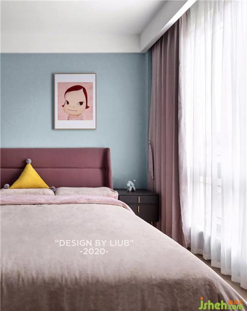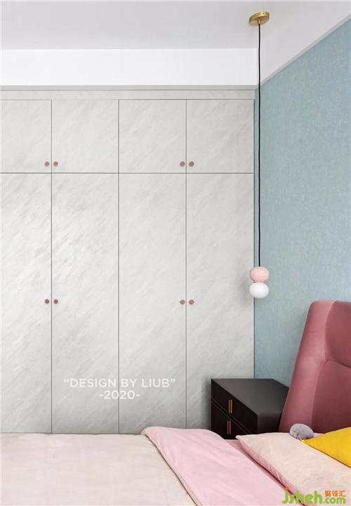 兩個女兒房延續(xù)了灰粉和灰藍為主色調,與柜門拉手和同系色彩的搭配,床上用品與這兩種色系交相呼應,隨之帶來了整體上互補的感覺。