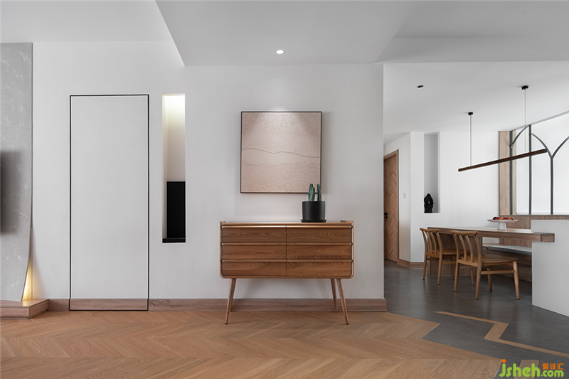 眾所周知侘寂是日本美學的一個組成部分,舟山室內(nèi)設(shè)計師本案也略用侘形來制造空間的樸素與安靜。