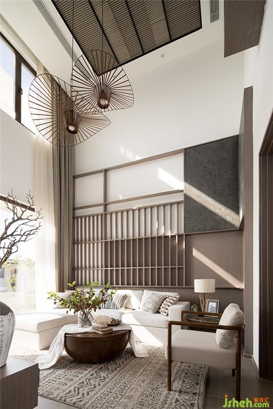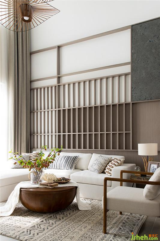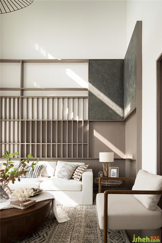我們?cè)诳蛷d的設(shè)計(jì)中選用的都是柔和十分的顏色與布料,絲毫不會(huì)有負(fù)擔(dān)感。連墻上與天花板上的線條設(shè)計(jì)都考慮了感官享受。