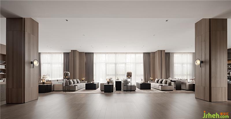 從遠處看,沙盤區(qū)頂部是一個巨大的圓形,淺灰色的天花與深灰墻壁相互照應(yīng),像是一個巨大的鉛球,給人予沉重質(zhì)感。設(shè)計師在視覺的終點設(shè)置了一面紙質(zhì)屏風(fēng),由層層切開的紙張做成箱體,紙層次會根據(jù)色彩及自然的生態(tài)做排列,在細節(jié)上看,高高低低的切割工藝,體現(xiàn)出最自然的藝術(shù)感。裝修公司