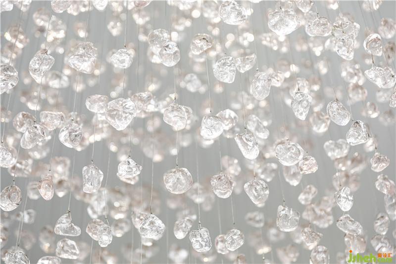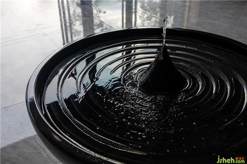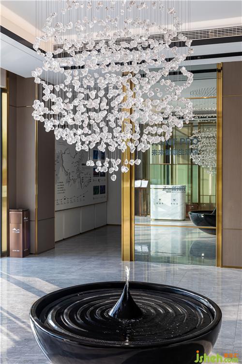 進入前廳,首先映入眼簾的便是乍浦的“水”,水滴形狀的不規(guī)則吊燈,跳躍的水珠緩解了縱向線條的單一和緊張,為空間增添了靈動感,與流水裝置的雕塑相互呼應(yīng)——水滴落在水面上,蕩起層層漣漪。