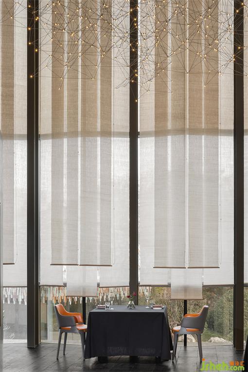 經(jīng)過一段小橋流水進入餐廳,作為從車水馬龍的鬧市向城市秘境的過渡,儀式感由此代入。這是一座三層挑高建筑,北京餐廳設計師以超大面積的玻璃幕墻隔開內(nèi)與外,屏蔽喧囂而沒有隔絕自然,天光以更溫柔的姿態(tài)映照室內(nèi)。戶外露臺是項目設計的亮點之一,在如此鮮有的地理位置上造一處安靜的“小園”,是魯采同比周邊環(huán)境的特色所在,客人悠然靜坐,盡顯情趣。