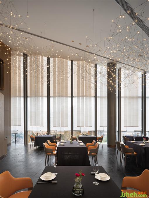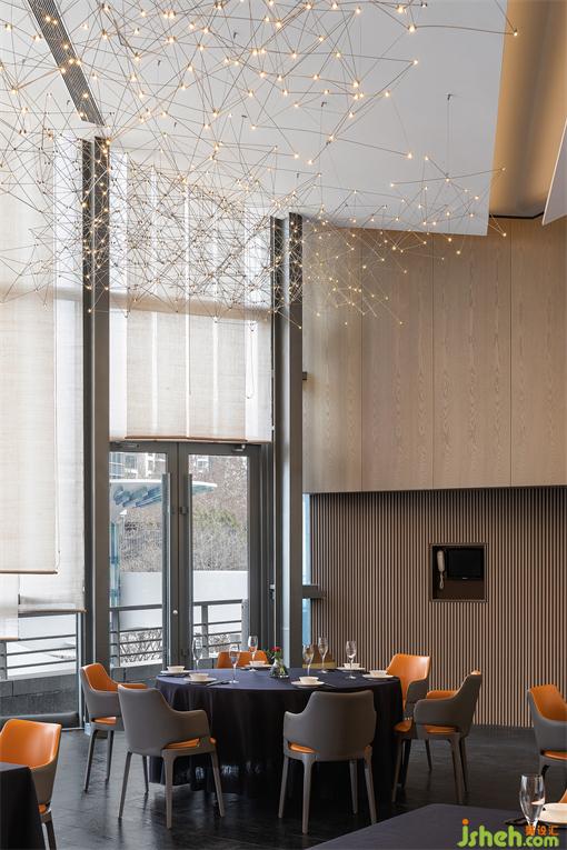 建筑穹頂是一個傾斜的坡面,北京餐廳設(shè)計師根據(jù)走勢,在每個空間都設(shè)計不同的天花吊頂,讓餐廳室內(nèi)一直是變化著的狀態(tài),為餐飲設(shè)計觸發(fā)了更多可能性與視覺張力。星空吊頂設(shè)計是一處亮眼的藝術(shù)裝置,小而精致的水晶般吊燈與絲線交錯,設(shè)計師在無序與有序之間營造宇宙星辰,為用餐的人們鋪添了許多溫暖。