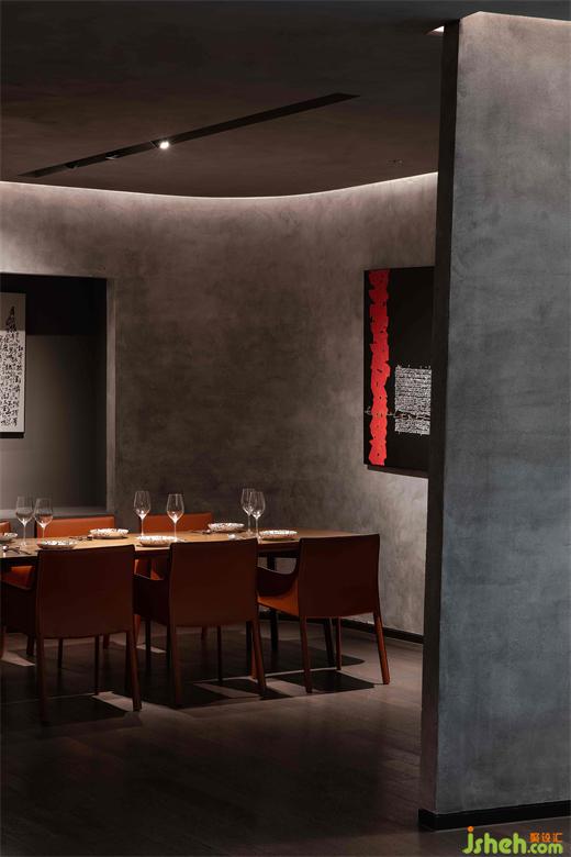 中央吧臺(tái)區(qū),北京餐廳設(shè)計(jì)師用玻璃磚和藝術(shù)肌理漆縱橫阡陌,特殊材料所帶出強(qiáng)烈的風(fēng)格特色,粗礪與精致交錯(cuò),為空間的賦予豐富的可能性。