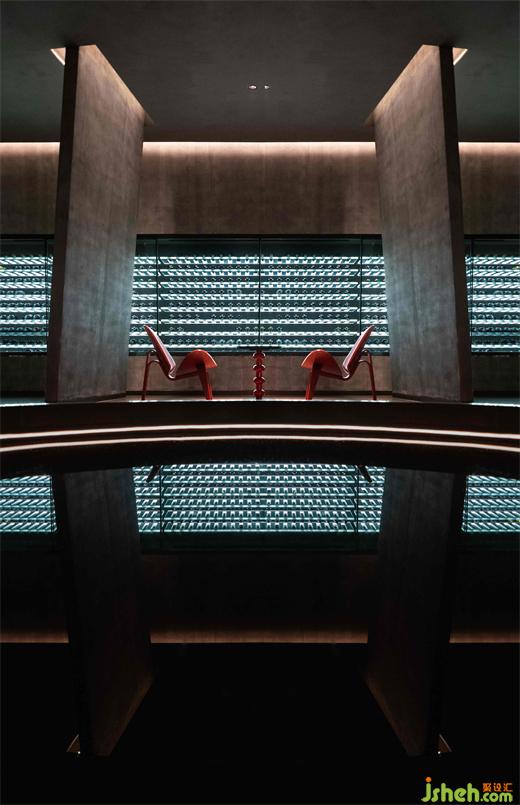 白天在自然光下兩種材質(zhì)呈現(xiàn)虛實(shí)之趣,晚間,中央吧臺(tái)琉璃磚由內(nèi)浸潤(rùn)出溫暖靜謐的光。