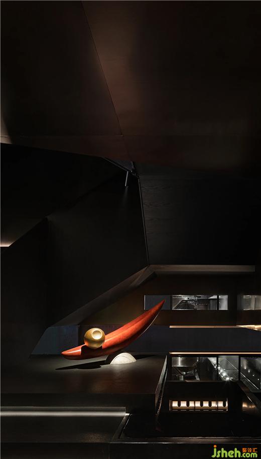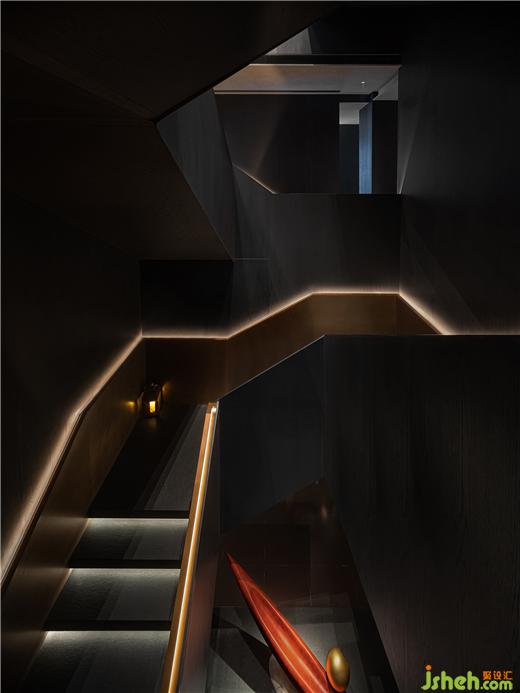 起承轉(zhuǎn)合,樓梯處于餐廳較為中央的位置,緊鄰明廚和散臺,作為聯(lián)結(jié)上下的通道,在暗色環(huán)境中尤為突出,就像一個(gè)中樞視覺點(diǎn),喜瑞餐廳設(shè)計(jì)既豐富了空間層次,在不同層面都可通過樓梯觀賞,又彌補(bǔ)了空間過度的空隙,弱化固有的空間感。轉(zhuǎn)折而開闊,一葉泛舟自成一景,彰顯一派大氣風(fēng)范。