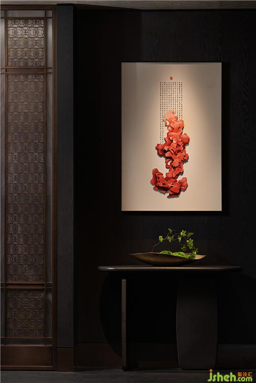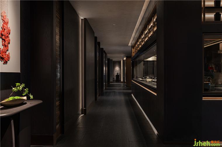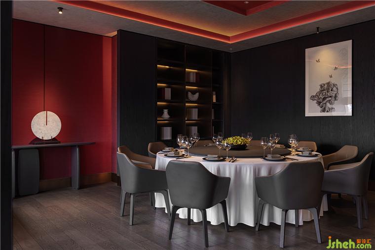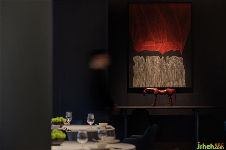 “饗”有著宴請,招待的含義,在穩(wěn)重色系背景下,喜瑞餐廳設(shè)計(jì)團(tuán)隊(duì)通過色彩來強(qiáng)調(diào)空間明暗對比,紅綠映襯,形成了有力的視覺沖擊,賦予空間無限活力。濃烈的色彩沉醉在黑色的溫柔鄉(xiāng)里,交織穿梭,如夢如幻。