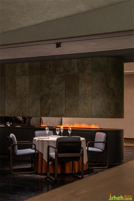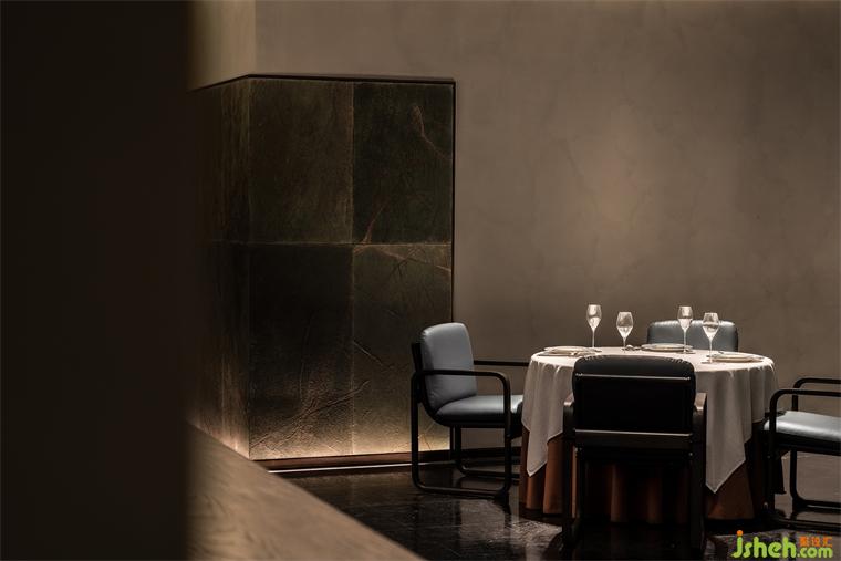 桌椅、地面采用的灰藍色系的顏色搭配,使得整個空間內散發(fā)出一種典雅流暢的氣息。柔和的燈光灑向整個空間,給予圍坐而談的人們充分的私密感與安全感。