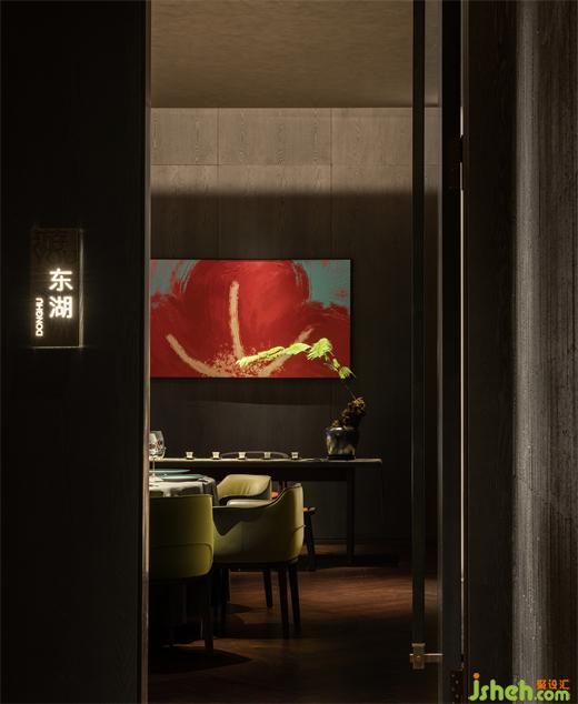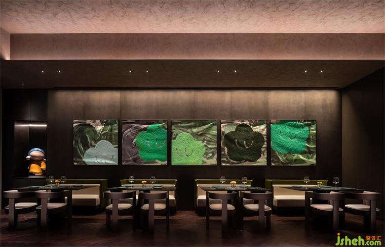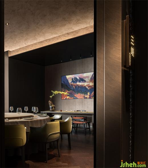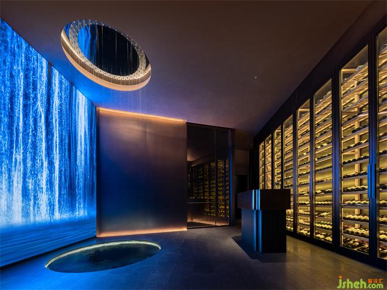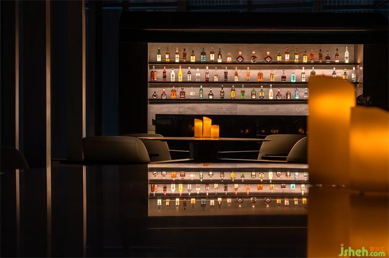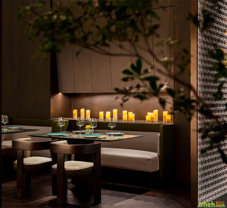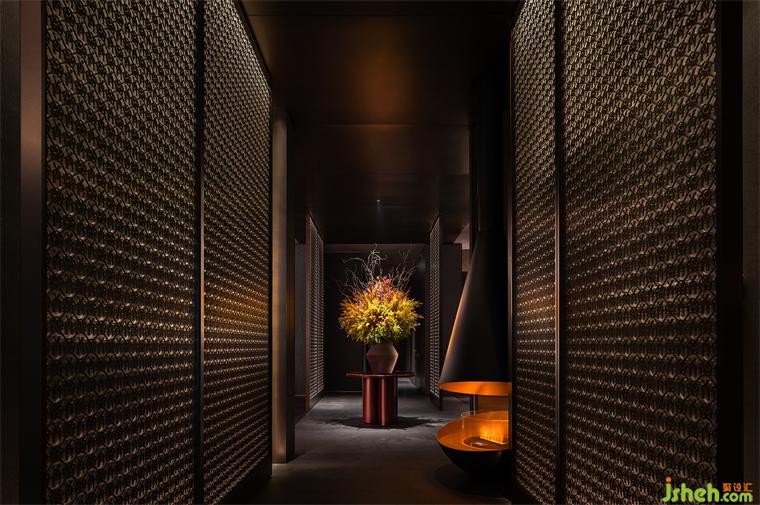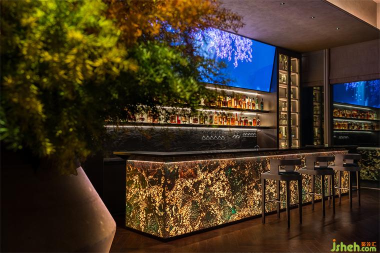 一側(cè)為大堂就餐區(qū),另一側(cè)為酒吧、下午茶休閑區(qū)。考慮到就餐、飲酒、下午茶處于不同時間段,餐廳設計空間劃分并未添加邊界明確的隔墻,而是以開放的形式來滿足使用者的需求。到了夜晚,透光石吧臺在燈光的點綴下,形成晶瑩剔透的水晶效果,質(zhì)樸的暗黑色墻面有了金色的燈光點綴局部,印刻出細膩豐富的紋理。
