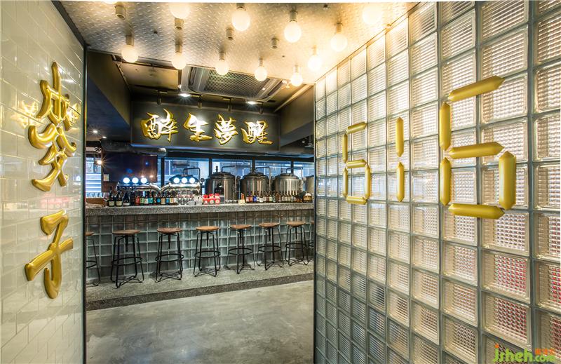 運用高低階梯差設(shè)計將酒吧區(qū)從整體中稍微區(qū)隔開,亮眼的“醉生夢醒”招牌讓這里更添享受當(dāng)下的氛圍。等待時坐在水磨石吧臺前,享用釀酒師新鮮釀造的季節(jié)性手工啤酒,讓舒緩的信號傳遞整個身體。