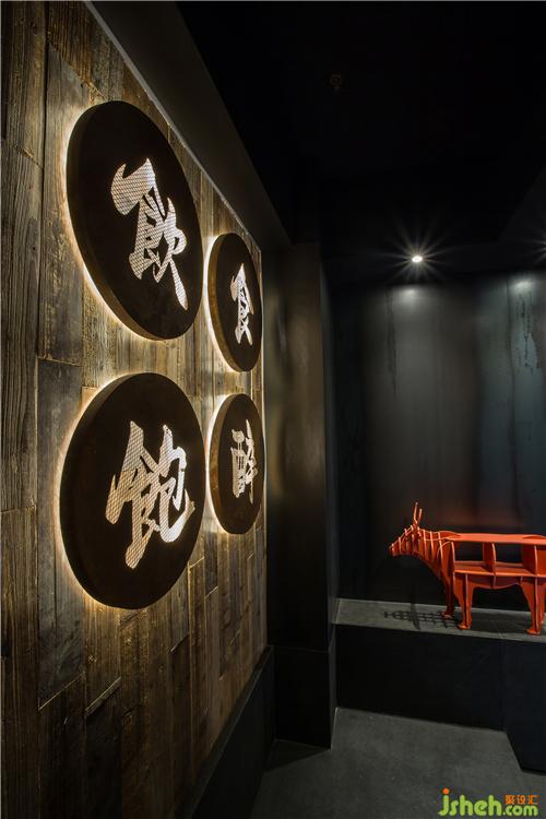 入口處以公牛藝術(shù)裝置和光暈招牌首先展示目的,踱步至主入口由玻璃磚墻和白色瓷磚墻圍合而成的展示墻,兩個金色的品牌標(biāo)識彼此相對,清楚地告知客戶店鋪由兩個不同的品牌集合而成。餐廳設(shè)計