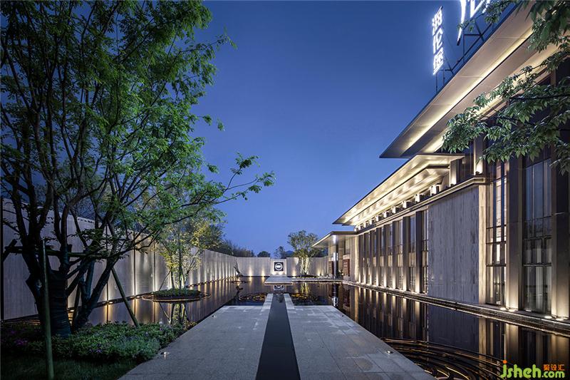 過雨園林,綠漸濃。當人們繞過影壁走進這一灣山水之中,眼前具有東方韻味的特色景墻與水景中的現(xiàn)代石路遙相呼應(yīng),在燈光隔帶的映襯下,景墻、建筑、石路、綠樹等實景在水中形成夢幻縹緲的倒影,一幅雅致秀逸、靜穆純粹而又富有時代風尚的新中式園林畫卷躍然而生。