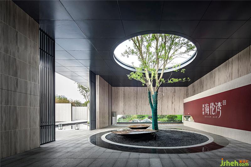 入口景觀區(qū)中央,立于「水」中的一顆樹,由內(nèi)向外生長,連接天地,煥發(fā)勃勃生機,成了人與自然交流對話的一扇窗。此處采用了東方侘寂美學的枯山水造景手法,以石為山,以砂代水,象征山巒與湖海,現(xiàn)代抽象的藝術(shù)表現(xiàn)形式如一幅留白的寫意山水畫,給人們留出無限遐想的空間。會所設(shè)計