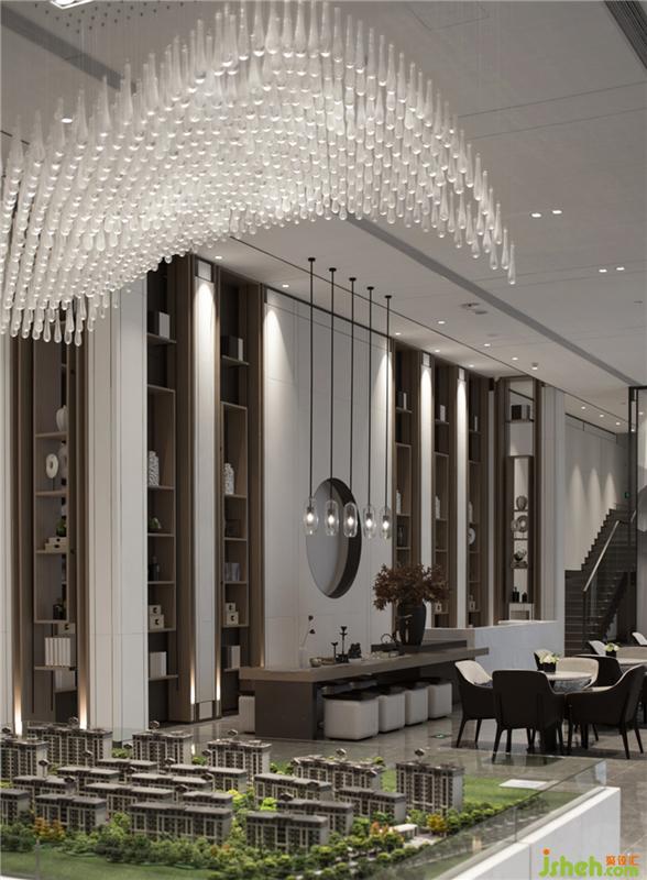 在空間關(guān)系的處理上,設(shè)計以簡明的線條勾勒空間的層次,打造自然與建筑和諧共生。通過重構(gòu)藝術(shù)的手法,運用點、線、面的構(gòu)成,對不同空間進行分切和組合,實現(xiàn)時空再造,情景再現(xiàn)。主要亮點體現(xiàn)在沙盤區(qū)上空的水晶裝飾燈,像一顆顆晶瑩剔透的雨滴錯落有序地排成一片,仿佛一場春雨裹挾著芳草的香氣淅淅瀝瀝從天而降,滋潤了整座城。