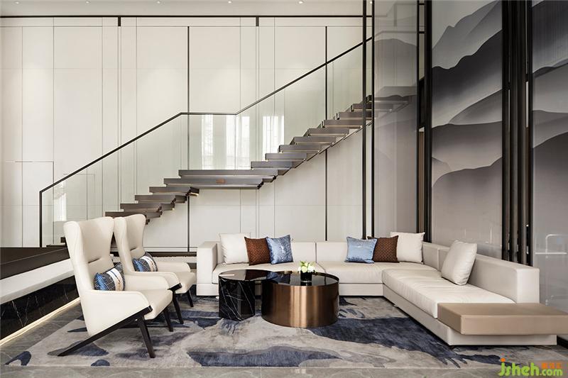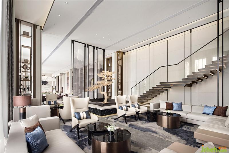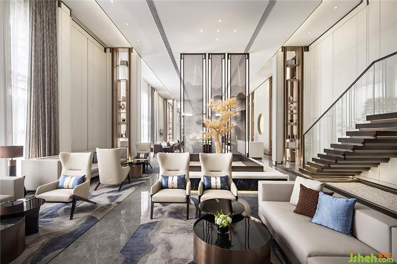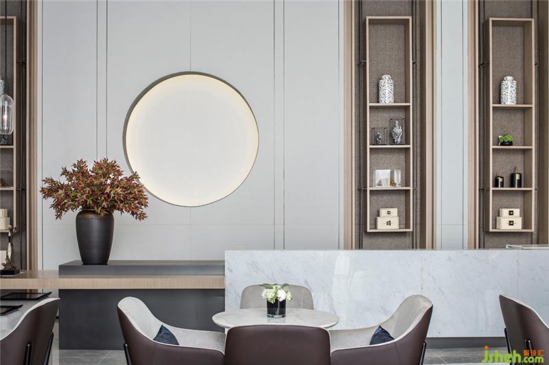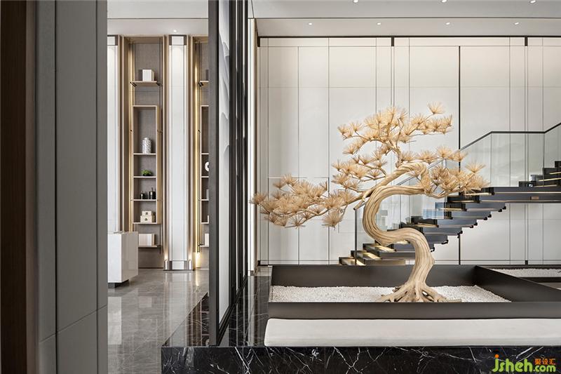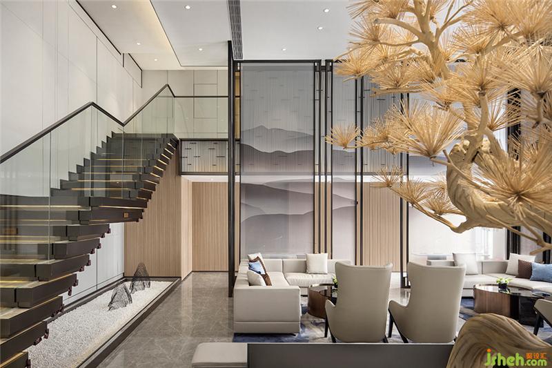 在VIP洽談區(qū),圍合式山水屏風(fēng)造景區(qū)和樓梯下的造景區(qū),同樣采用了枯山水的造景手法,以近于「空無」的枯淡靜寂,呼應(yīng)室外風(fēng)景,給室內(nèi)增添一絲詩意的趣味。會所設(shè)計(jì)