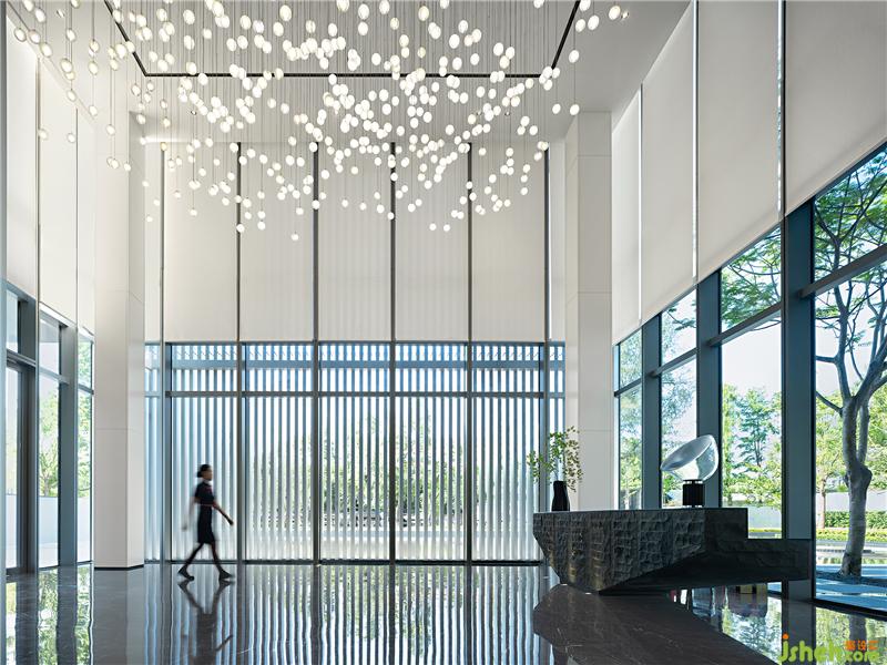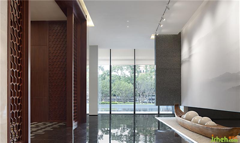 結(jié)合水鄉(xiāng)的特色,展示中心入口處設(shè)置了一池鏡面水景,建筑倒影在水面上,與周圍環(huán)境融為一體,打造出唯美的水鄉(xiāng)意境。