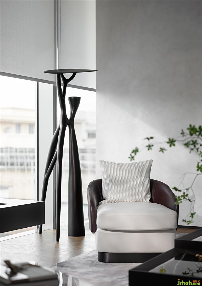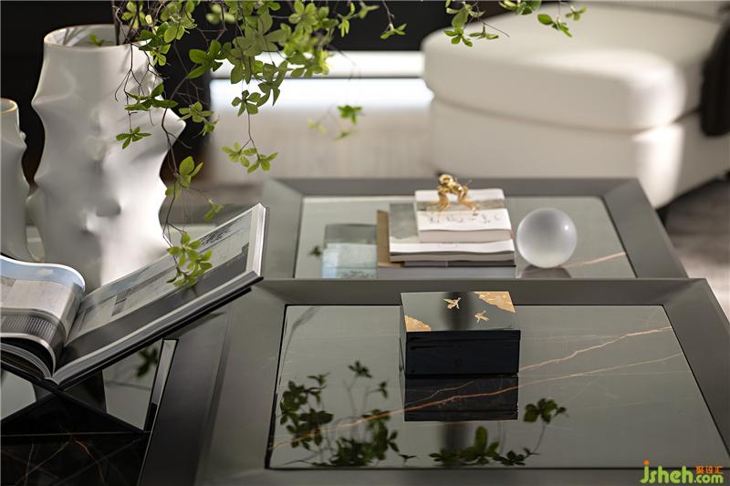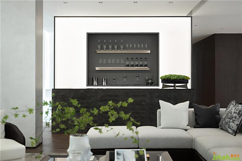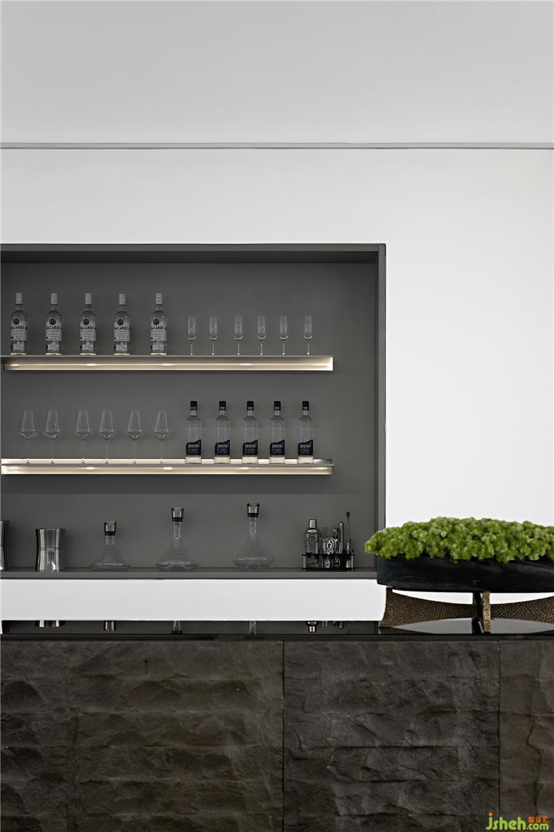 與一層接待臺相呼應(yīng),二層水吧臺同樣運用了天然的原石材質(zhì),粗狂的石材與空間的白色基調(diào)及精致細膩的珠寶元素形成強烈對比,增加了空間豐富的層次和內(nèi)涵。吧臺上綠植的點綴,讓整個空間更加的靈動和諧。