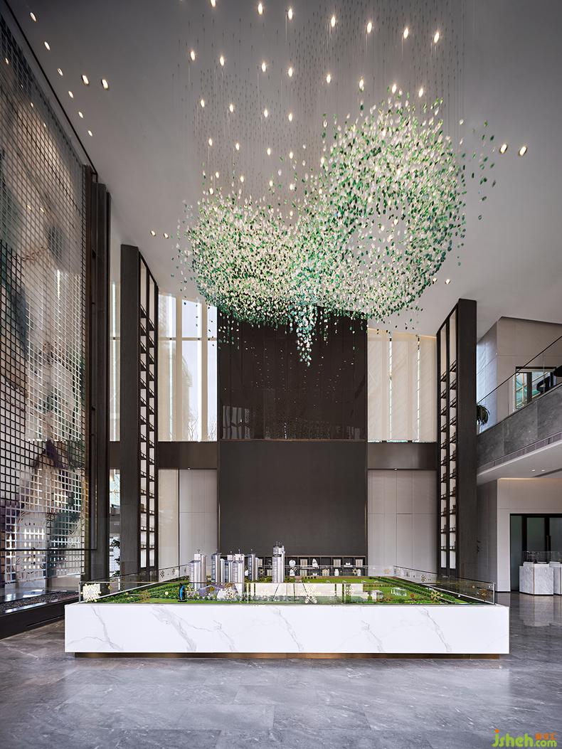 沙盤區(qū)藝術(shù)吊飾由上萬(wàn)顆不規(guī)則的琉璃石子制成,融入當(dāng)代藝術(shù)之美,綠白相間,銷售中心設(shè)計(jì)疏密有致,如煙雨入江南,清新自然的氣息撲面而來(lái)。巨幅藝術(shù)裝置上的現(xiàn)代寫意山水,從高處飛流直下,氣勢(shì)恢宏。
