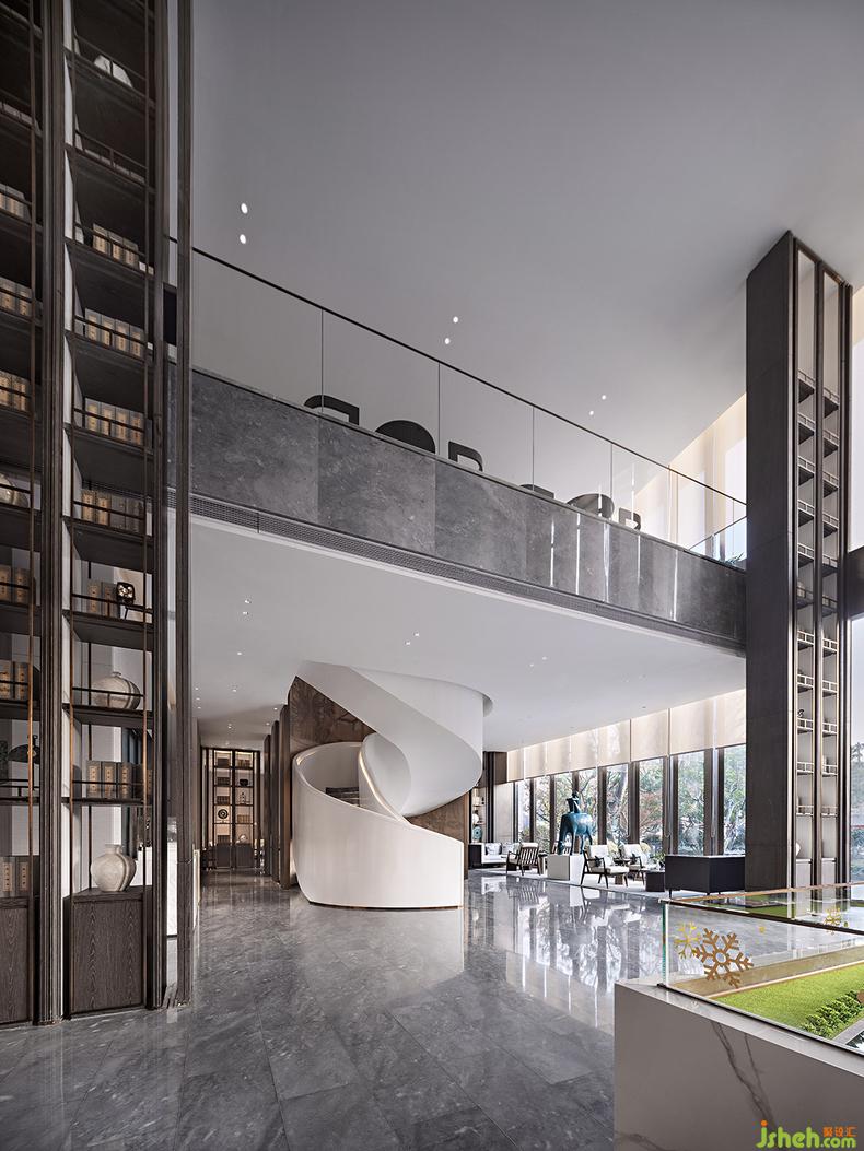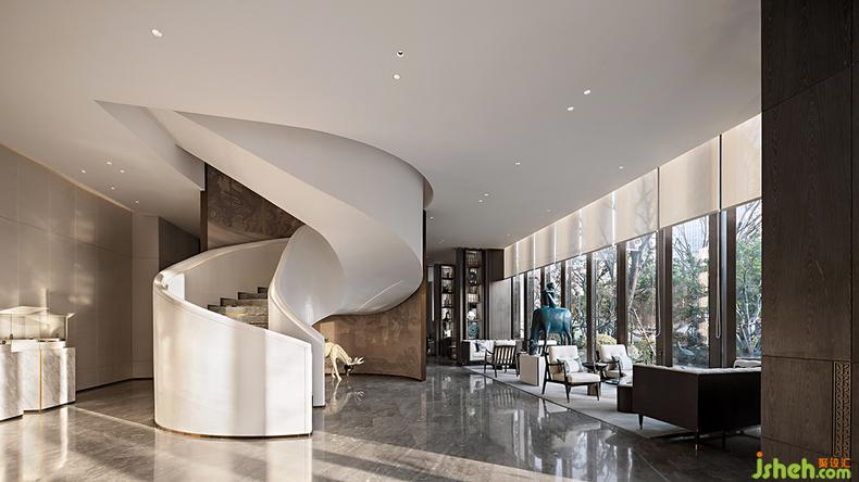 海螺形的旋轉(zhuǎn)樓梯,有著柔美的弧形曲線,極簡(jiǎn)的純白色,與天花融為一體,銷售中心設(shè)計(jì)銜接上下兩個(gè)空間,既滿足了功能的需求,又展現(xiàn)出現(xiàn)代藝術(shù)的格調(diào)。
