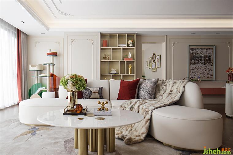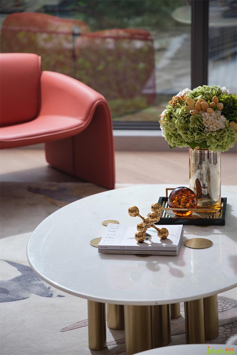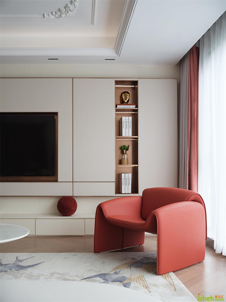 客廳是家庭互動(dòng)核心區(qū),承載著休憩、娛樂、會(huì)客等多重功能?;野卓臻g搭配原木地板,朱紅色沙發(fā)椅、抱枕點(diǎn)綴其間,簡約高級(jí)而又充滿藝術(shù)氣息。瞰景陽臺(tái)通透明凈,安坐家中即可盡攬室外山水。