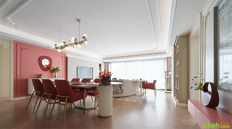 粉色背景墻自然地將餐廳從客廳中劃分出來,融入溫馨浪漫的情調(diào)。樣板房設(shè)計(jì)金屬大理石餐桌搭配朱紅色皮質(zhì)餐椅,豐盈了空間的層次感。藝術(shù)吊燈與花藝上下呼應(yīng),讓人感受到三餐四季里的安然與詩意。
