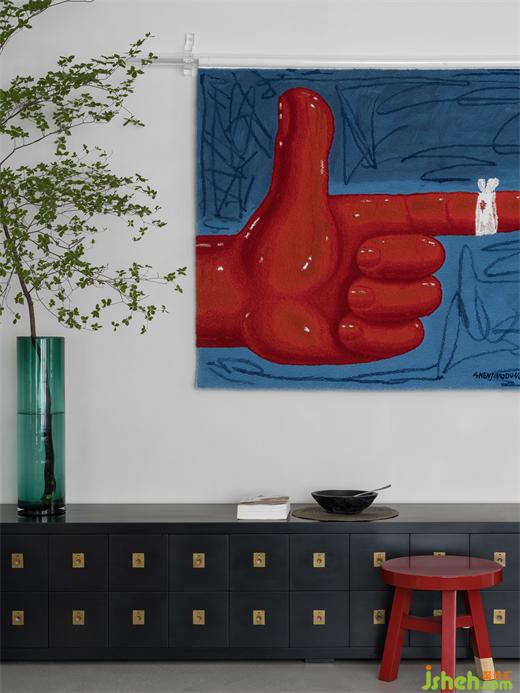 邊柜的造型是老式中藥鋪的草藥柜模樣,只一眼便仿佛聞到了中草藥的獨(dú)特氣味。其上也裝飾著同系列的復(fù)古感陶瓷容器。別墅裝飾墻上的高對(duì)比度的藍(lán)紅色明麗畫作充滿的抽象的西方現(xiàn)代時(shí)尚之感,而充滿中式鄉(xiāng)村復(fù)古氛圍的紅色的木頭小圓凳與畫完美呼應(yīng),不同的文化元素相撞卻產(chǎn)生了極度和諧的效果。