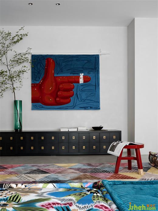 高飽和度的幾何圖形掛畫,墨綠色的沙發(fā),紅色的可愛兔子座椅,莫蘭蒂色地毯,別墅裝飾使靜態(tài)的極簡(jiǎn)之家充滿靈動(dòng)的藝術(shù)時(shí)尚感。