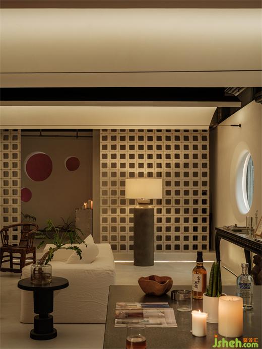 上海辦公室設(shè)計柔軟亞麻布面純白沙發(fā)與中式復(fù)古的扶手椅安靜對望,承載著歲月的沉靜與古樸。圓窗透出柔和而朦朧的暖光,給空間帶來私密性的同時,仿佛給整個空間加上了柔光濾鏡,輕柔安寧。