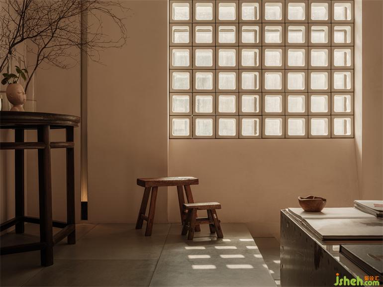 拾級而上,繞過磚紅色的柱體來到二樓,上海辦公室設(shè)計被拉長的網(wǎng)格狀陽光便灑在腳邊。陽光,陶罐,枝葉,帶有歲月痕跡的大小木凳,仿佛穿越回記憶中的童年時光,沒有煩惱,只有無盡的,無憂無慮的盛夏。一種生動的靜謐,帶著回憶沉淀的安寧。