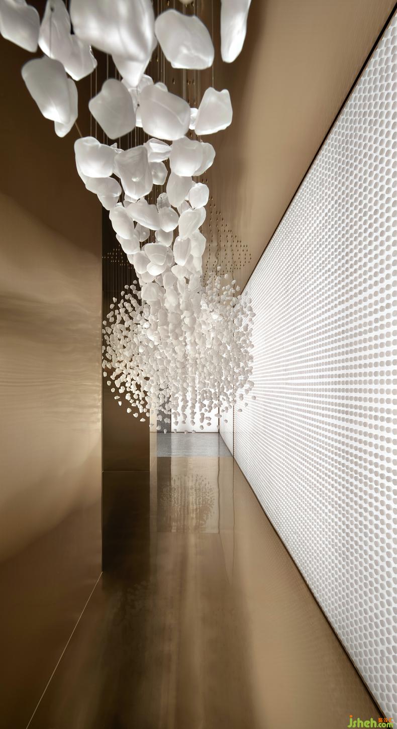 在立面鑲嵌的圓形磨砂亞克力的序列圖像襯托下,懸浮的藝術(shù)裝置似花瓣翩躚起舞,售樓處設(shè)計似繁星傾瀉灑落,于半空中凝結(jié)成詩,韻律生動,風(fēng)流婉轉(zhuǎn)。