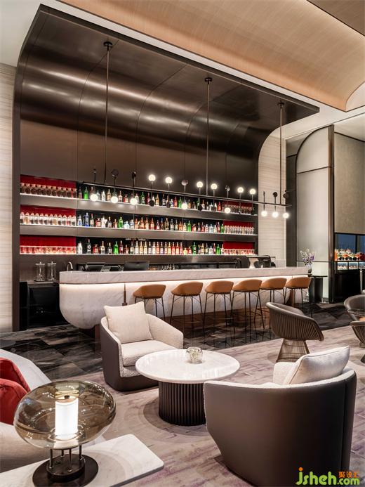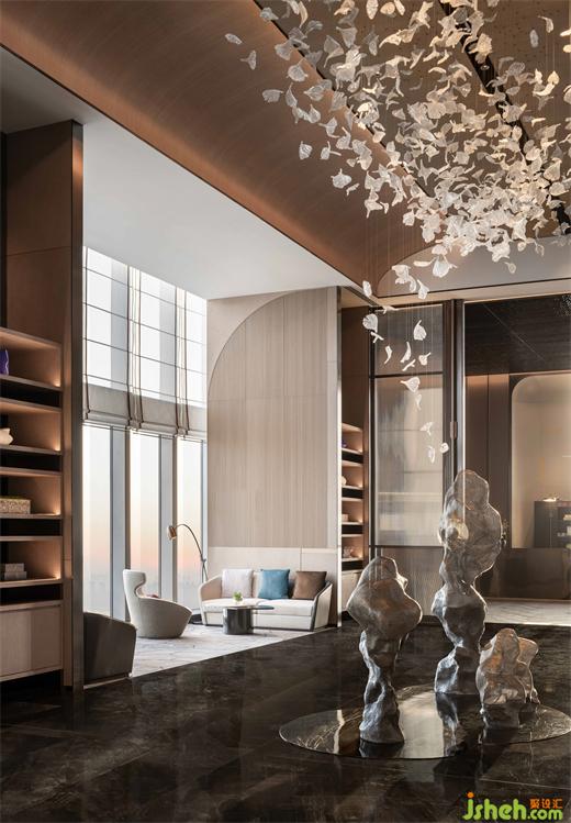 設置巧妙卻不張揚的藝術品,非空間主角,卻成為勾連時間與空間的鑰匙。酒店設計以泉水取色,以泉眼取形的水晶藝術裝置,似思緒靈感的怦然迸發(fā),粲然亦奪目;又似可穿梭古今的時光機,回觀是百載商埠的繁盛浩瀚,展望是當代都會的摩登新潮。