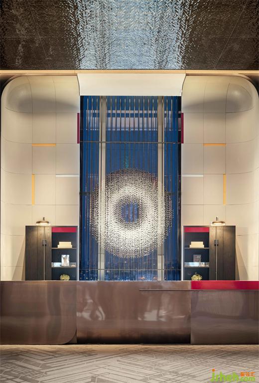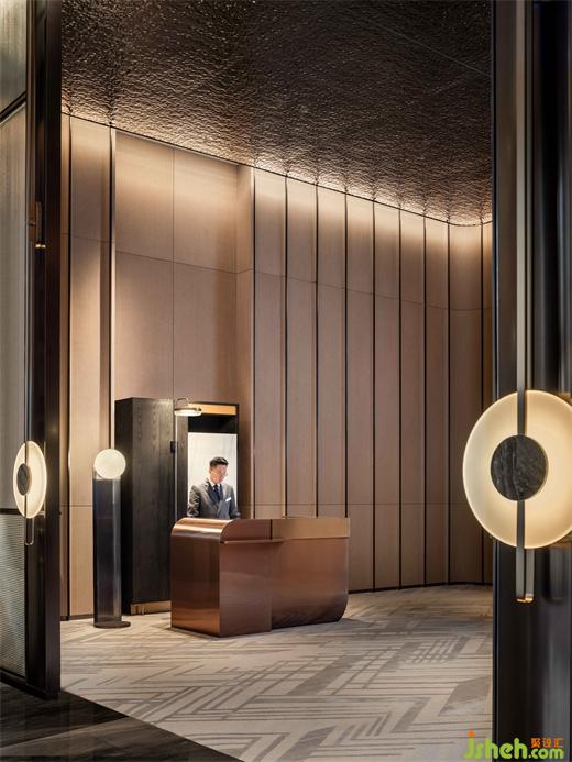 水波紋不銹鋼鏡面天花,于賓客踏入接待區(qū)的瞬間,即產(chǎn)生有趣的對影。酒店設計設計者對空間的寄望,一一投射于微觀處的精雕細琢。材質考究,光影自成,精致基調已定,場域一派自在豐盈。