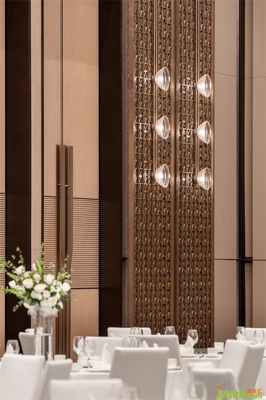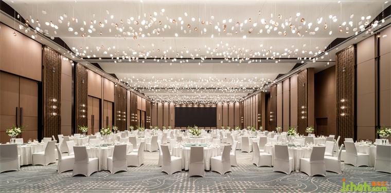 天花波瀾,燈飾起伏,宴會廳翻涌的波浪天花造型與錯(cuò)落有致的波紋狀圓形燈飾組合,重現(xiàn)了印度詩哲心中的濟(jì)南盛景。粼粼泉水,映射眼前,燈光乍亮,大者如珠,小者如璣,酒店設(shè)計(jì)仿若泉涌,靈動(dòng)萬千。