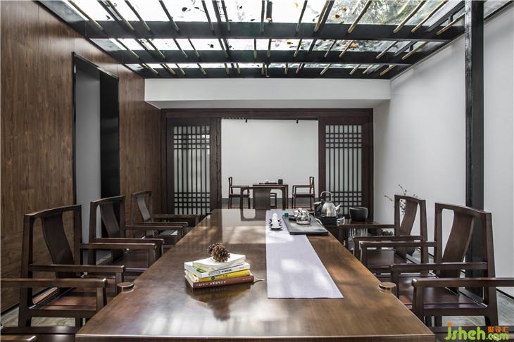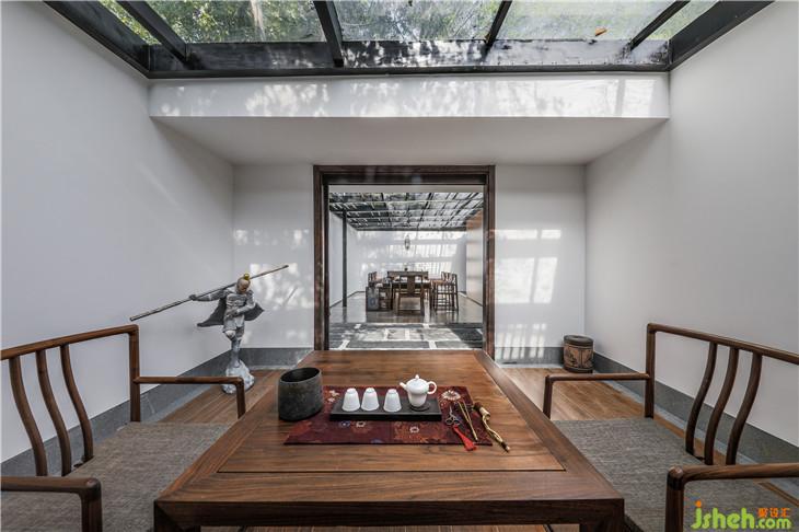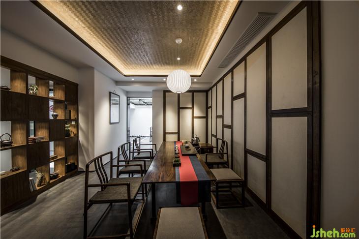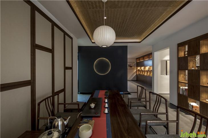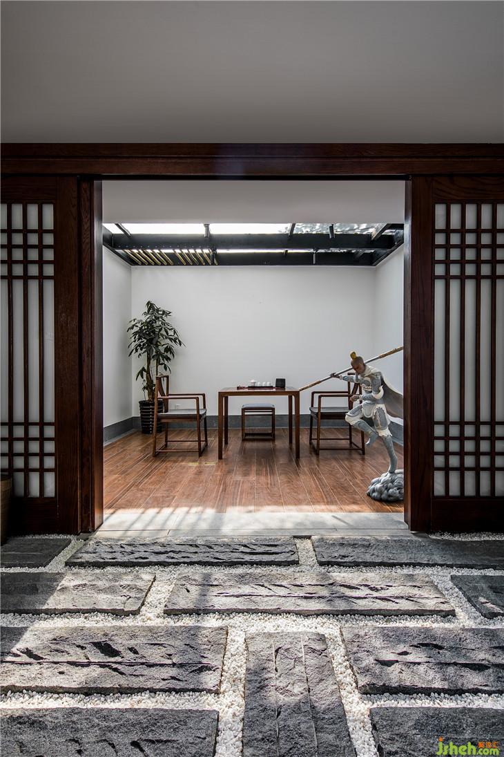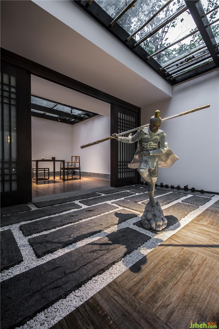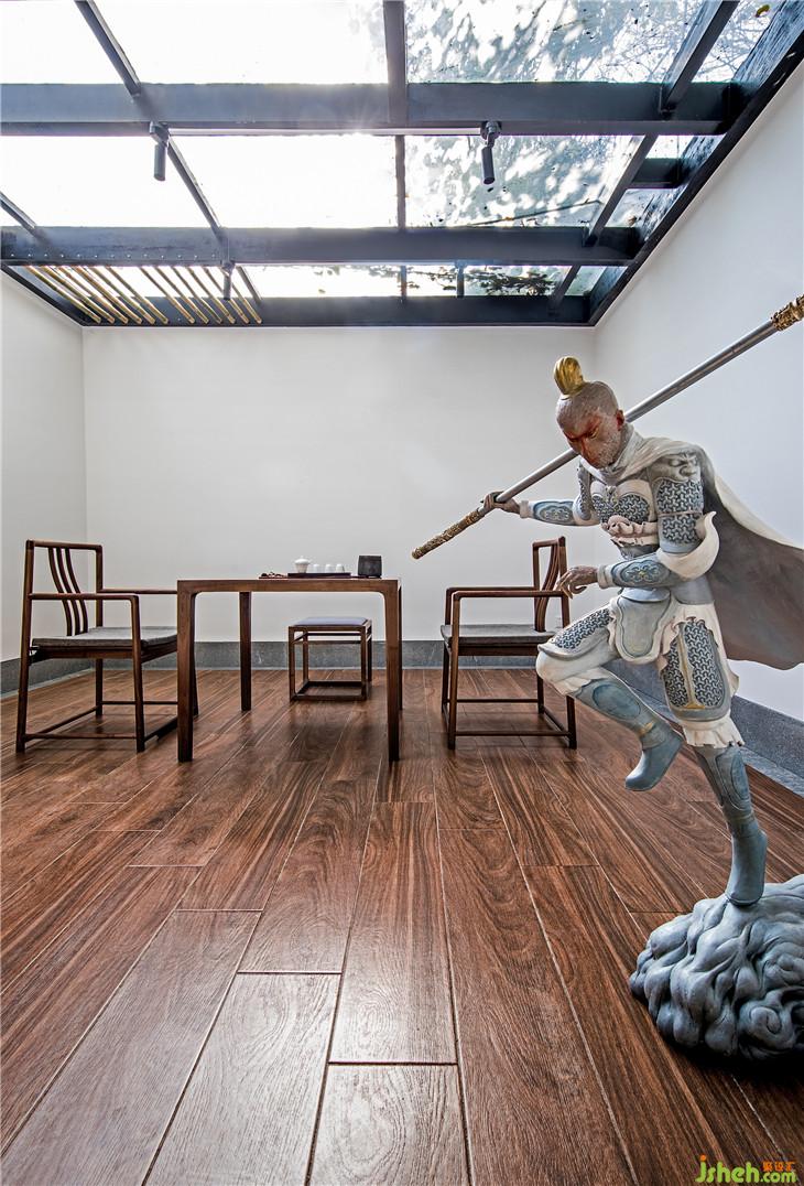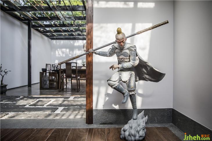 品茗區(qū)一側(cè)是一個茶廂,因悟空的加入,空間被賦予了豐富與復雜的價值內(nèi)涵。縱觀悟空的一生,從灑脫不羈的齊天大圣到拈花而笑的斗戰(zhàn)勝佛,可以說是一個喪失自我的悲劇。借助一個悟空,設(shè)計師給雅人致士留下了足夠的臆想與揮毫空間,也提醒著每一個戴著“緊箍咒”的喝茶人,直面內(nèi)心,找回自我。