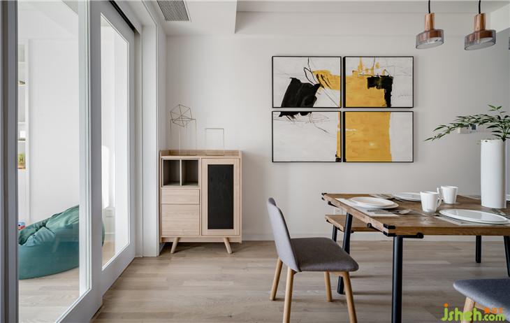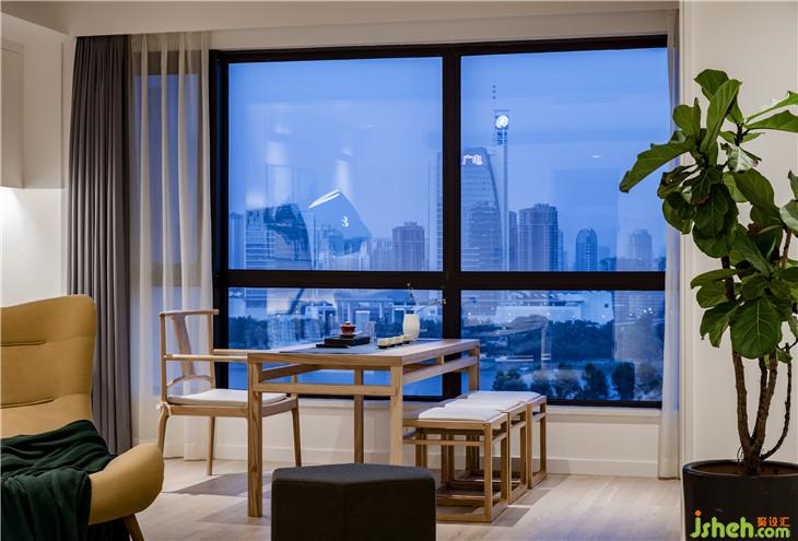 客廳一側(cè),整面的落地玻璃窗,引入室外明亮的自然光線,讓空間更加通透開闊。而原有的陽臺(tái)位置,則打造成了品茗區(qū),是居者追逐靜心的絕佳場(chǎng)所??蛷d和餐廳采用了開放式布局,延伸的木地板和白色墻面將兩個(gè)功能區(qū)連為一體。