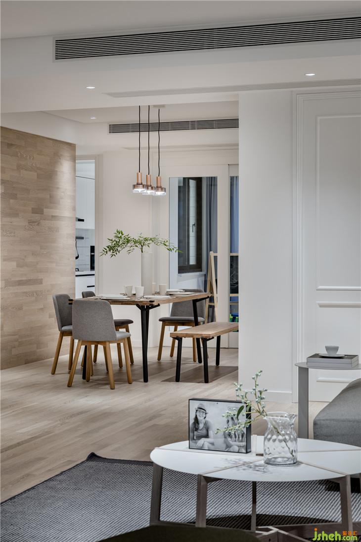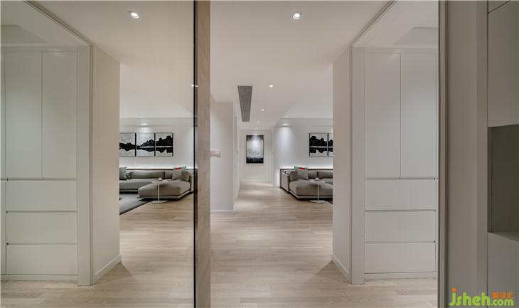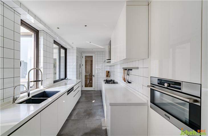 娛樂(lè)區(qū)的一側(cè)是廚房,整體以白色為主色調(diào),營(yíng)造整潔干凈的空間氣質(zhì)。