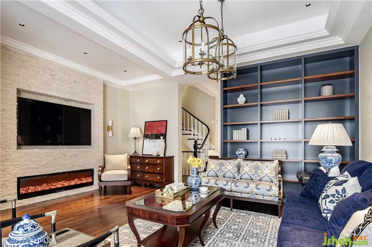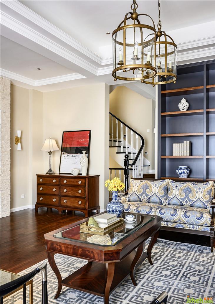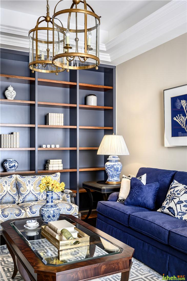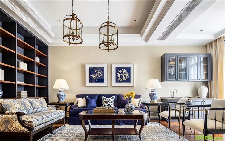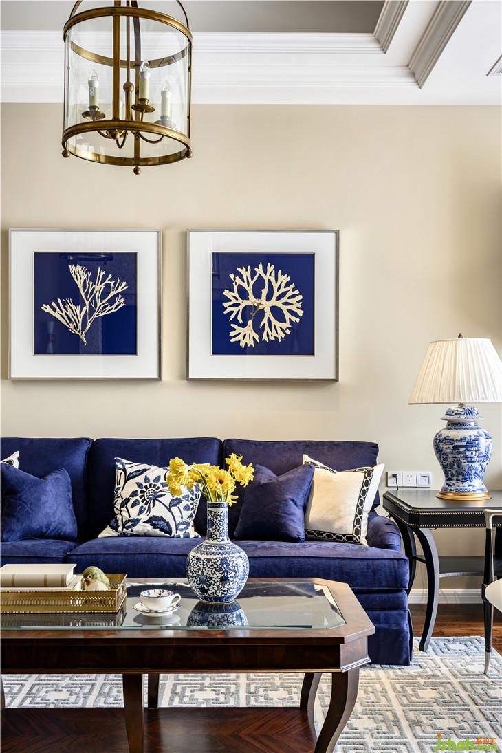 色彩上,寧靜且富有質(zhì)感的灰藍(lán)占據(jù)C位,搭配美式家具、復(fù)古造型的吊燈,將空間內(nèi)斂而深刻的美式奢華與優(yōu)雅情調(diào)延展開來。