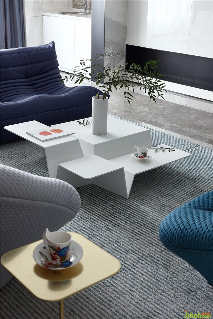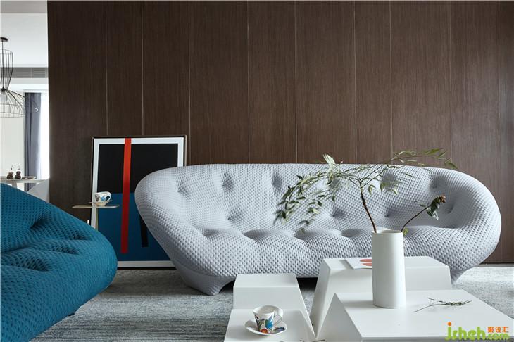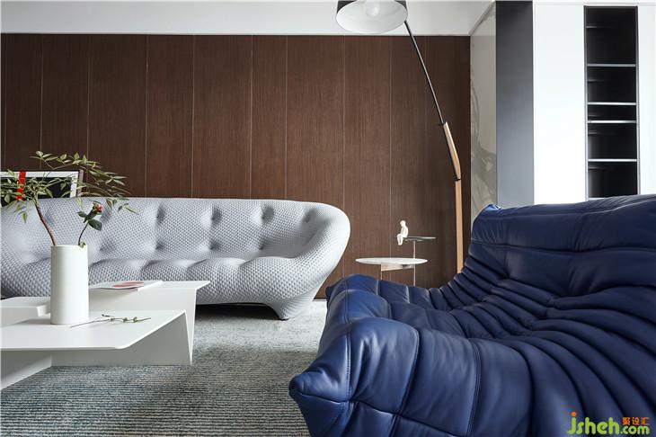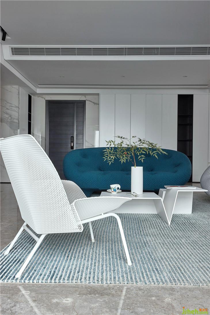 在客廳,寧靜深灰藍(lán)與低雅灰的組合就像是靜謐的海面上,薄霧裊裊,詩意無限。而亮白色的加入,仿若一線天際之間天光乍破,于平靜之中內(nèi)斂著無限生機(jī)與力量。