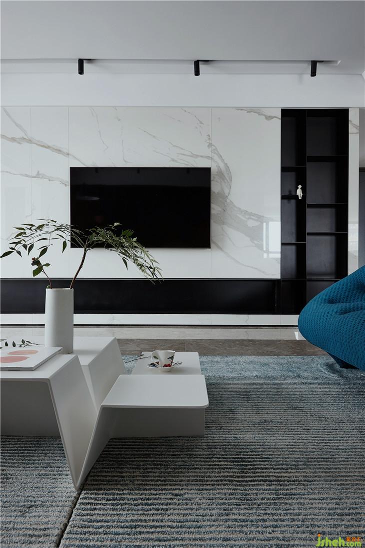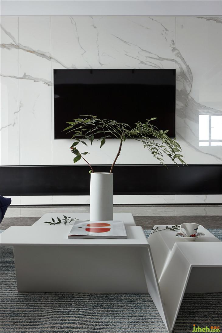 選材上,更多地以空間的冷暖平衡為出發(fā)點,而大理石和木飾面正是天平的兩端。木飾面素雅的色澤配搭著藍(lán)白的清雅,再以綠植添色,為空間帶來了春天般溫潤鮮活的氣息。