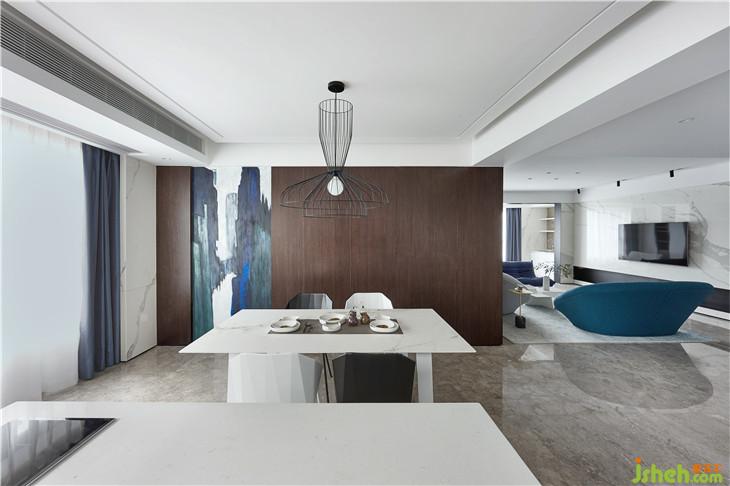餐廳延續(xù)客廳時尚輕奢的基調(diào),在色彩上,大面積的白,更加放大了深灰藍(lán)的寧靜氣質(zhì),讓空間如潔白的云朵般輕盈,以足夠的包容去承載居者生活中的眾多美妙時刻。
