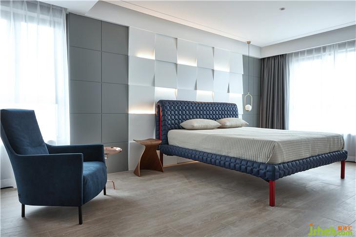 同樣的色彩組合在臥室呈現(xiàn)出沉靜洗練的質(zhì)感體驗。多面飄窗,讓居者、空間與光無阻礙對話。極簡燈飾的不對稱搭配,獨特造型的背景墻,打破了空間的單調(diào)感,動靜之間的微妙平衡將空間品質(zhì)彰顯的淋漓盡致。