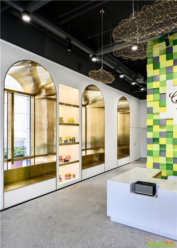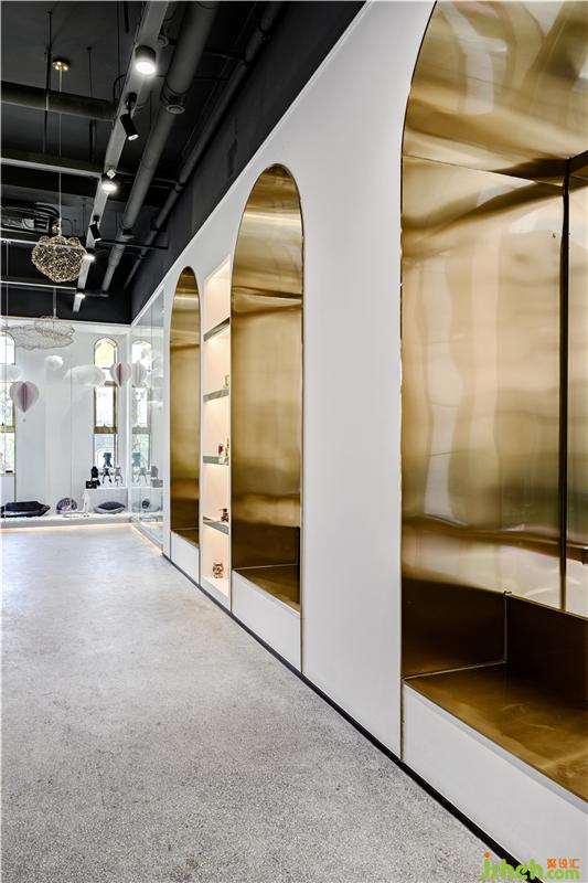 大面積的留白中,材質(zhì)本身的特質(zhì)被充分發(fā)揮出來。展示櫥窗玻璃和金屬元素的組合,地面以統(tǒng)一的水磨石鋪貼,配合頂部的云狀吊燈點(diǎn)綴,在極簡的美學(xué)語境中催生出了浪漫、精致的個性。