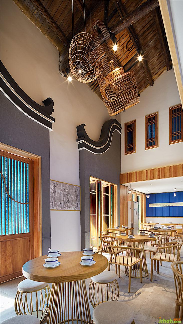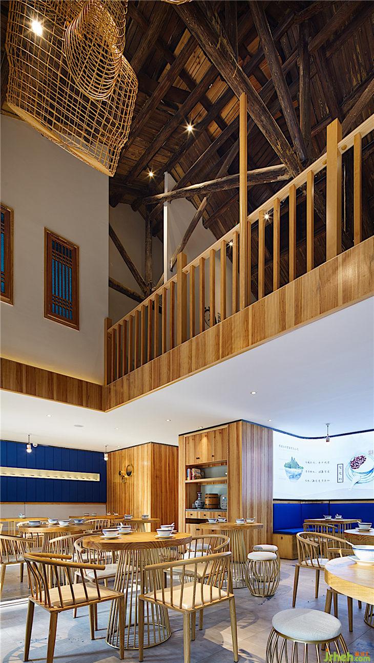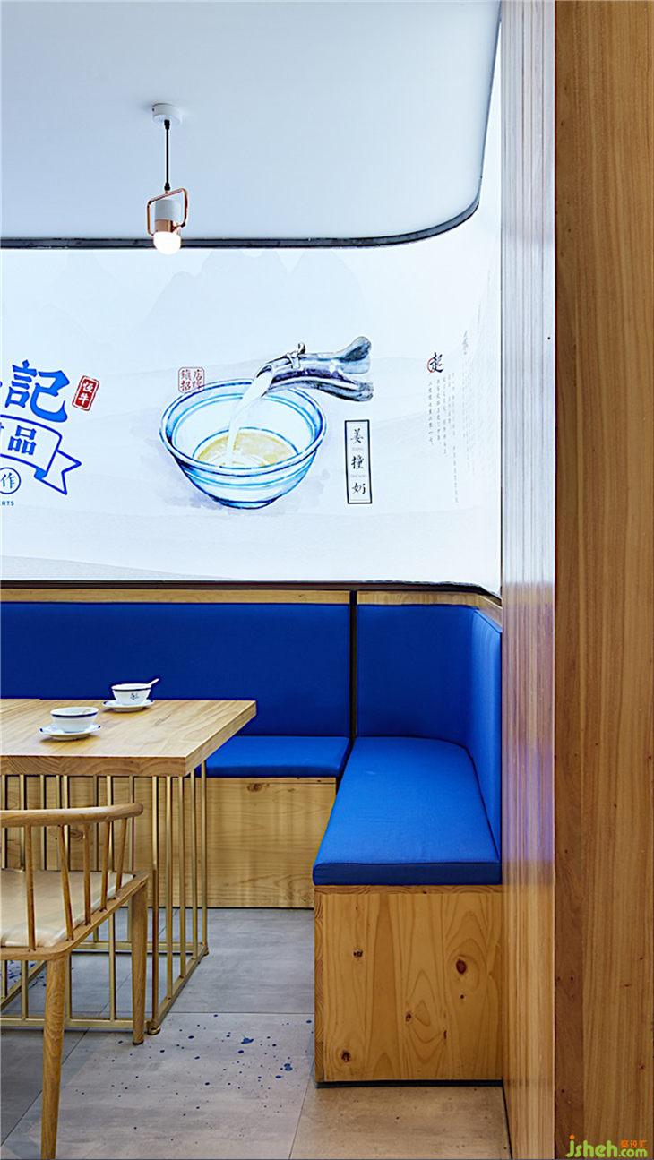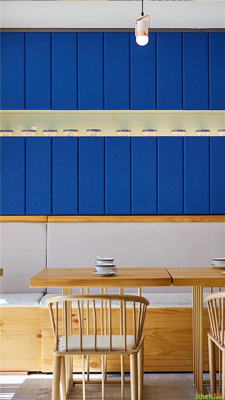 主材名稱:老榆木、壓花玻璃、槽鋼、鐵板、白色氟碳漆、榆木飾面板、藍(lán)色麻布硬包、藍(lán)色水墨仿古地磚