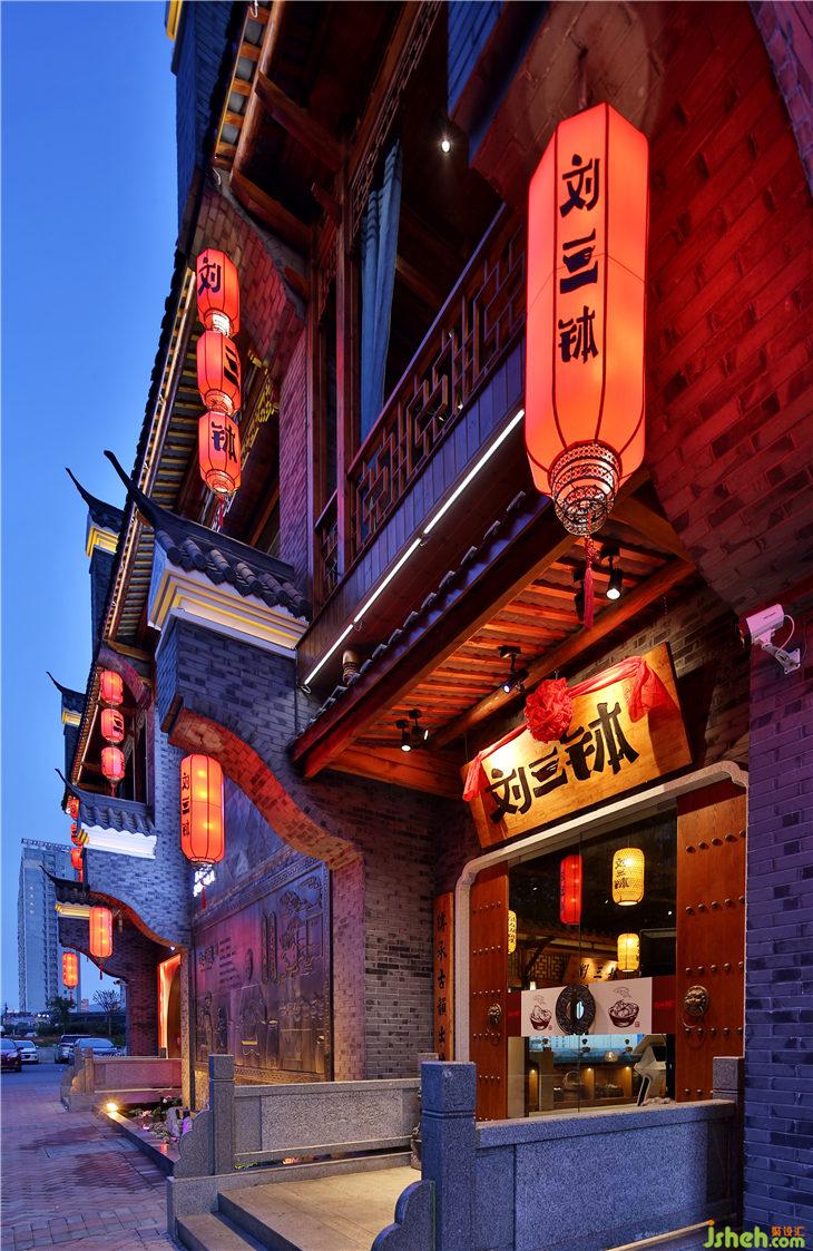 在整個空間中,通過利用空間布局的方式,將就餐區(qū)分為多個空間,并賦予每個空間獨(dú)特的文化屬性,使當(dāng)?shù)匚幕谡w空間中進(jìn)行融合與統(tǒng)一。同時通過造景的方式將室內(nèi)營造出室外空間的感覺,利用燈光的設(shè)計進(jìn)行氛圍的體現(xiàn)。外立面則運(yùn)用了大量燈籠裝飾的概念,喜慶古典的紅燈籠串聯(lián)起來給這個建筑增添更多古色古香的元素。當(dāng)夜幕降臨后,半透明自發(fā)光的燈籠模樣也在眾多商業(yè)店面脫穎而出。一、二樓大廳也采用了傳統(tǒng)文化的物件之一燈籠裝飾,使得內(nèi)外的空間軟裝元素相融合,燈籠上帶著獨(dú)特的店內(nèi)主打菜品的名稱設(shè)計,通過光與影的結(jié)合,闡述餐廳靜謐而內(nèi)斂的美,也為客人留下了深刻印象的重要標(biāo)志。