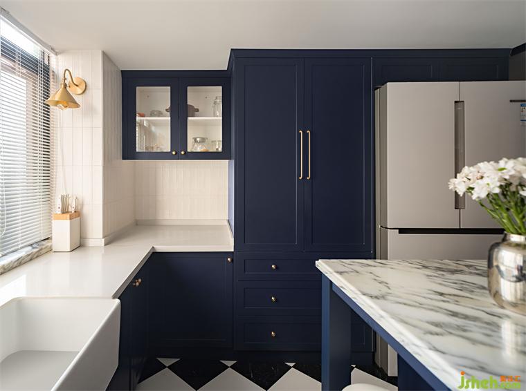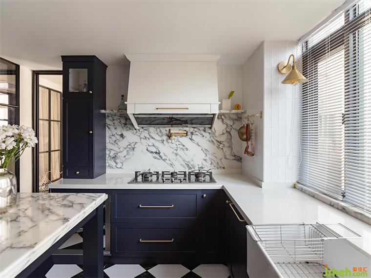廚房的改造是令業(yè)主尤為驚喜的,我們用掉了原先一整個房間的面積作為廚房使用,它與餐廳在視覺上保持交互,是一個可開合的半開放式空間,內(nèi)部以一個中島臺為中心,四周建立廚房的各項功能,廣州復(fù)式設(shè)計深色的櫥柜搭配淺色的雪花白大理石,有著不言而喻的優(yōu)雅氣質(zhì)。而原有的大窗戶也成就了這個陽光充沛的廚房,在陽光中烹飪的愜意,再加上那落日玫瑰吊燈、量身定做的煙機罩、爐上龍頭,這些元素讓人不禁有做一頓美食的沖動,共赴視覺盛宴。